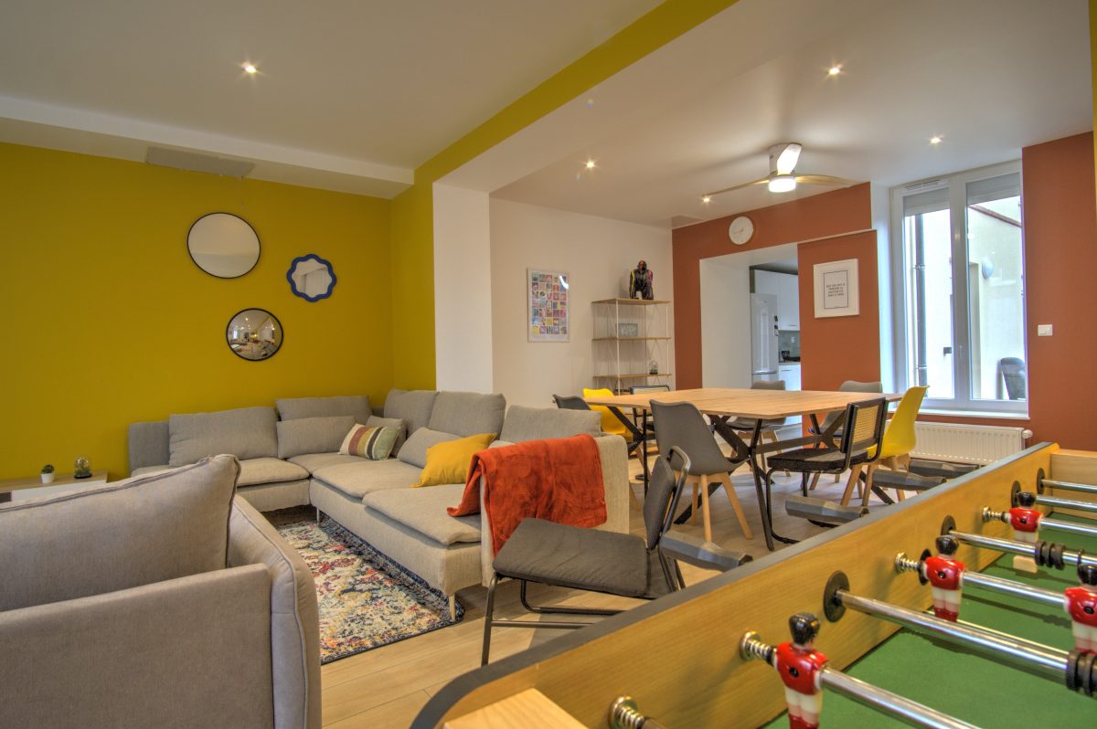 – Un espace salon/ salle à manger de 40 m2 avec babyfoot, TV, canapés et 2 grandes tables pour partager les repas entre résidents