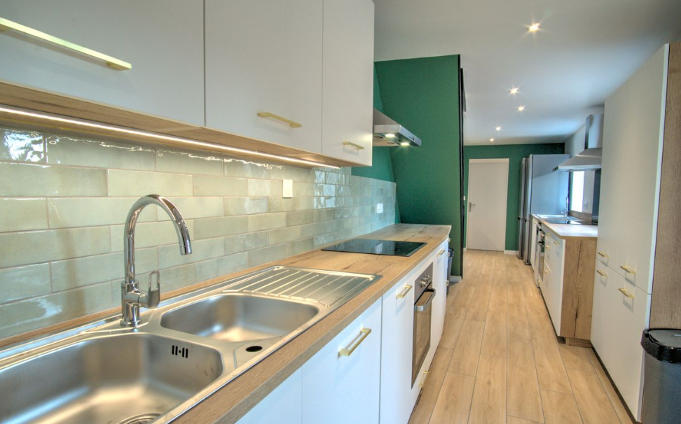 – Une cuisine double de 20 m2 tout équipée : 3 grands frigos, 2 éviers, 2 plaques chauffantes, lave-vaisselle… et bien sûr le nécessaire pour cuisiner et manger